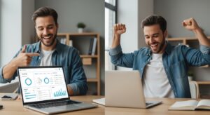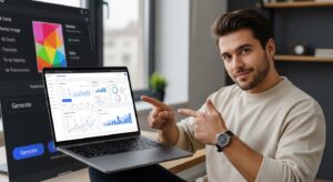 But the person in the referenced image is now looking towards us and holding his arms to make a cheering gesture, indicating he’s happy that he’s saved money after using the spending tracker being shown on screen. I’ll simply click on where it says generate. There is our image looking beyond perfect as expected, guys. Now, what we will do, you might have guessed, is we’ll create a video from both of these. What I will do is simply select both of them with the shift key selected on my keyboard. Click on this dropdown where it says three more, and simply click on where it says generate video. And I’ll just say something like the person is first pointing to his laptop screen showing the spending tracker and then looks at it, realizing how much money he’s saved for the month.