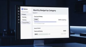 Now, if I scroll down to where it says monthly budget by category, you’ll see these different categories on the left-hand side. food and dining, housing, transportation. And the way that you use this tracker is at the beginning of each month. What you would do, guys, is set your budgets, right? So, let’s look at an example. So, for food and dining, we have a budget of $600. Let’s say that so far we’ve spent $160, represented by this progress bar, which is 27% of that allocated budget, and we have $440 remaining. Now, let’s say that it’s a special month. You need to have an anniversary dinner where you’ll go absolutely nuts, and you’ll spend, let’s say, $600, right? So, you’ll go over your budget.