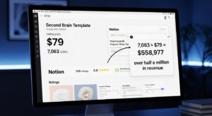 This particular template is made with Notion, which we’re going to be talking about in just a second. And while we can’t see how much they’re making in monthly revenue, what we can see is the listing price, which is $79. And we can also see that they’ve made over 7,000 sales. So, with a simple calculation, if I do 7,063, which is the number of sales, multiplied by the listing price, which is $79, that means this particular Notion template has generated over half a million in revenue. And with over 269 ratings, which are overwhelmingly positive with a review score of over 4.9, we can infer by dividing the number of ratings, 269, by the amount of sales, 7,063, that on average, almost 4% of everyone who purchases this second brain template does proceed to actually leave a review.