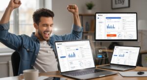 He lifts his arms up with a cheering gesture. I’ll simply click on where it says generate again. Just like that, our video has been created for us. Let’s quickly hit play. All right, perfect. And of course, you can also follow those exact same steps by creating images too by saying, for example, create a professional looking Etsy mockup displaying the notion template on a laptop, clicking onto where it says generate, and it will do exactly that, which will only add to how much we are able to stand out among the competition for those other successful notion listings on Etsy. Also, we know that with a type of notion template that we are now suddenly able to create without any coding whatsoever. And by uploading those videos that we are now rapidly able to create in KD to a really high standard, we know that listings with video again get twice as many orders on average.