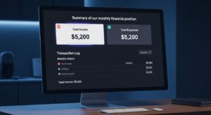 Before we start doing that, guys, let’s first review this template to see not only how it looks, but also how it functions. making sure that everything is functioning correctly. Look, we’ll start from the top. We have our summary of our monthly financial position. Total income, total expenses, which are from the data below. As you can see in the transaction log, the monthly salary is 5,200 for the month, total income is also 5,200.